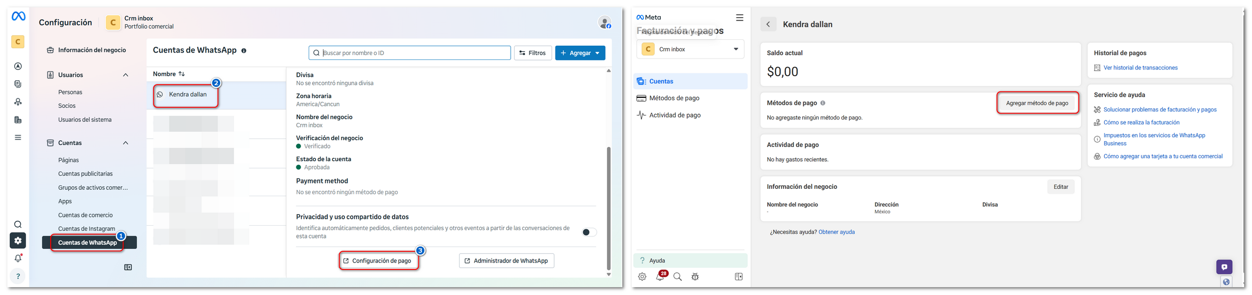 4. Una vez asignada, Meta mostrará la tarjeta como Activa o Predeterminada, quedando lista para los cobros de plantillas y evitando bloqueos en CRMInbox. Con la tarjeta correctamente configurada y asignada, el cliente puede regresar a CRMInbox, continuar la integración del número, recibir el código y habilitar el envío de plantillas sin problemas.