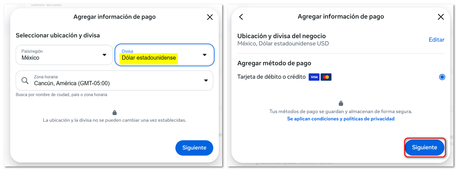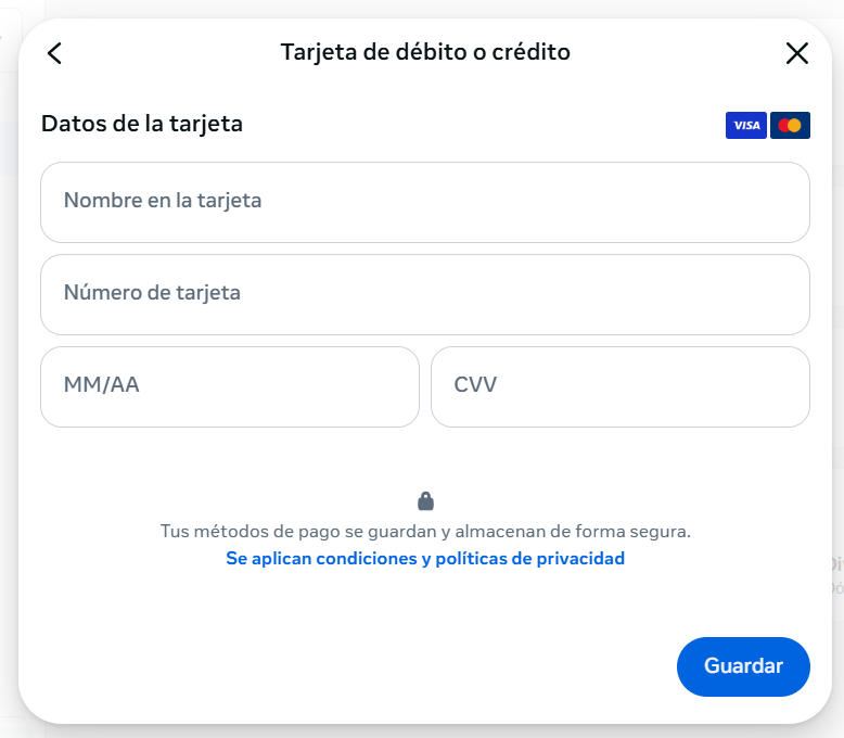 3. Meta solicitará la información completa de la tarjeta: nombre del titular, número, fecha de vencimiento y código de seguridad. La tarjeta debe permitir compras online e internacionales.