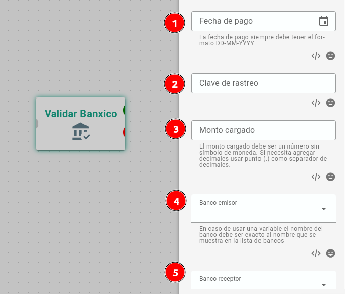 El bloque Banxico verifica los datos del comprobante de pago ante Banxico para validar su legitimidad. Necesitas proporcionar la fecha de pago, clave de rastreo, monto, banco emisor y banco receptor exactamente como aparecen en el comprobante. El bloque devolverá si el comprobante es válido o no.