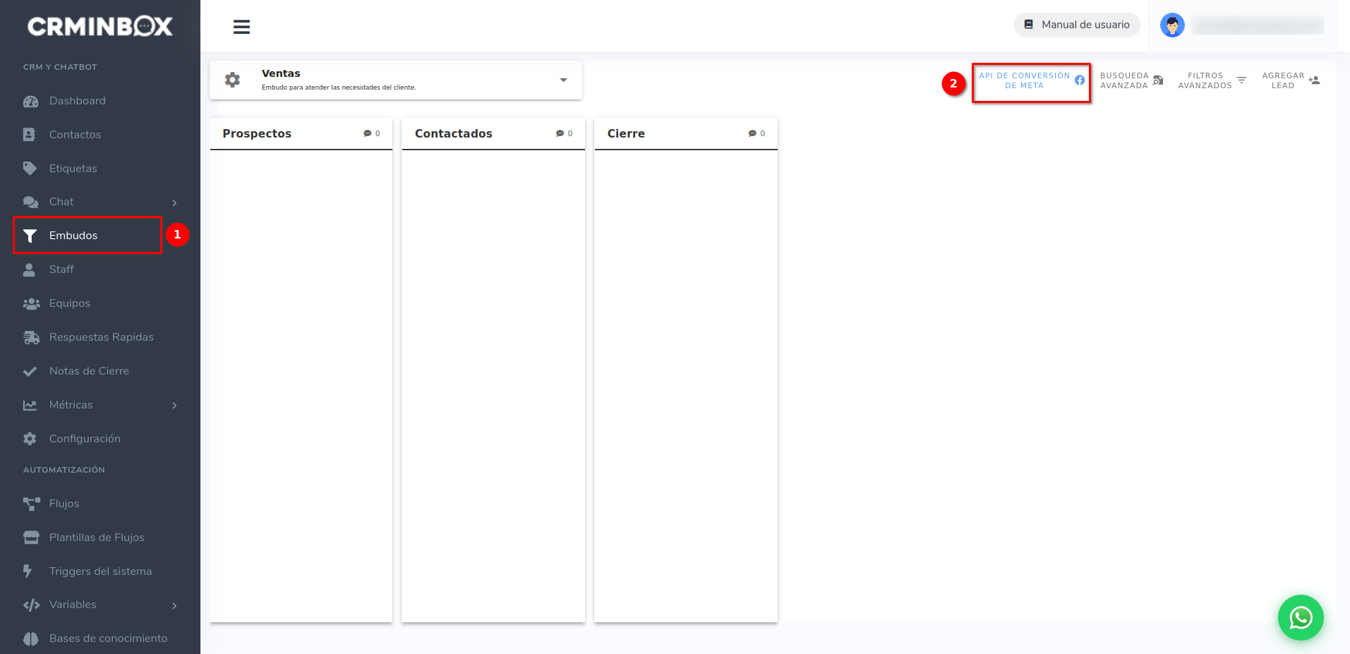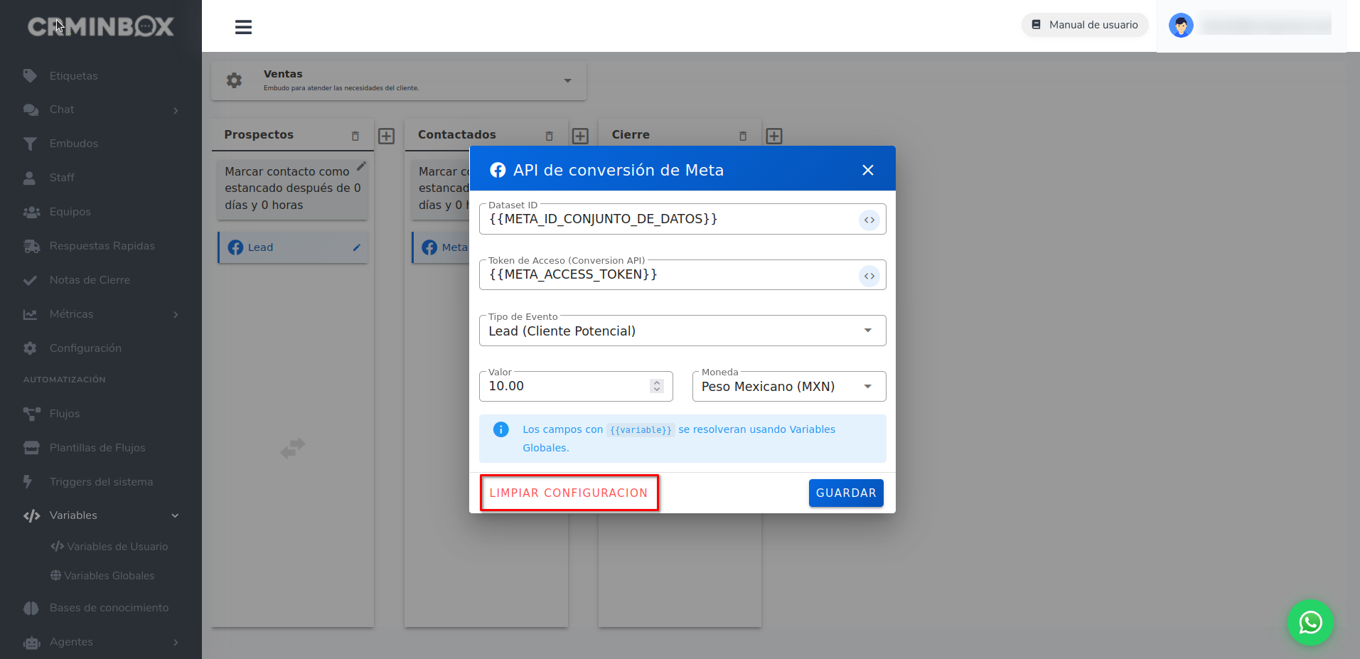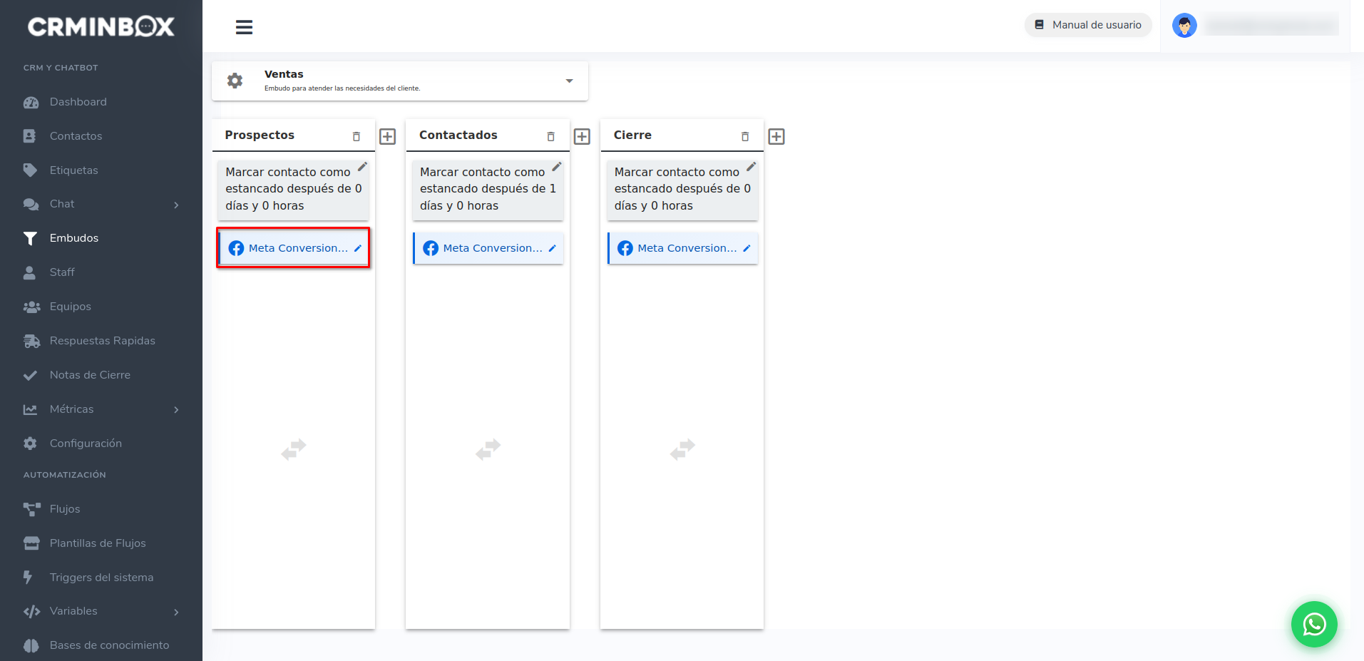Si hay un error en las credenciales o el servicio de Meta no está disponible, el contacto se moverá de etapa normalmente. El fallo en el envío del evento no afecta el funcionamiento del embudo.