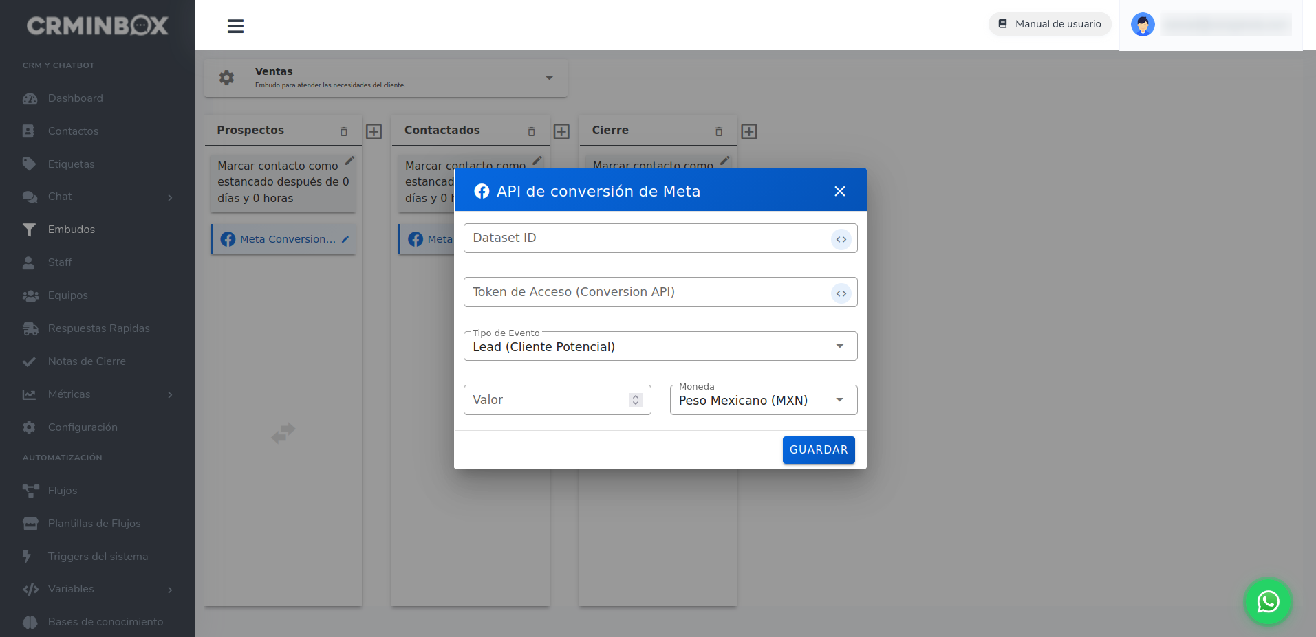 Tipo de Evento: selecciona el tipo de evento estándar de Meta que se enviará cuando un contacto llegue a esta etapa. Las opciones disponibles son: