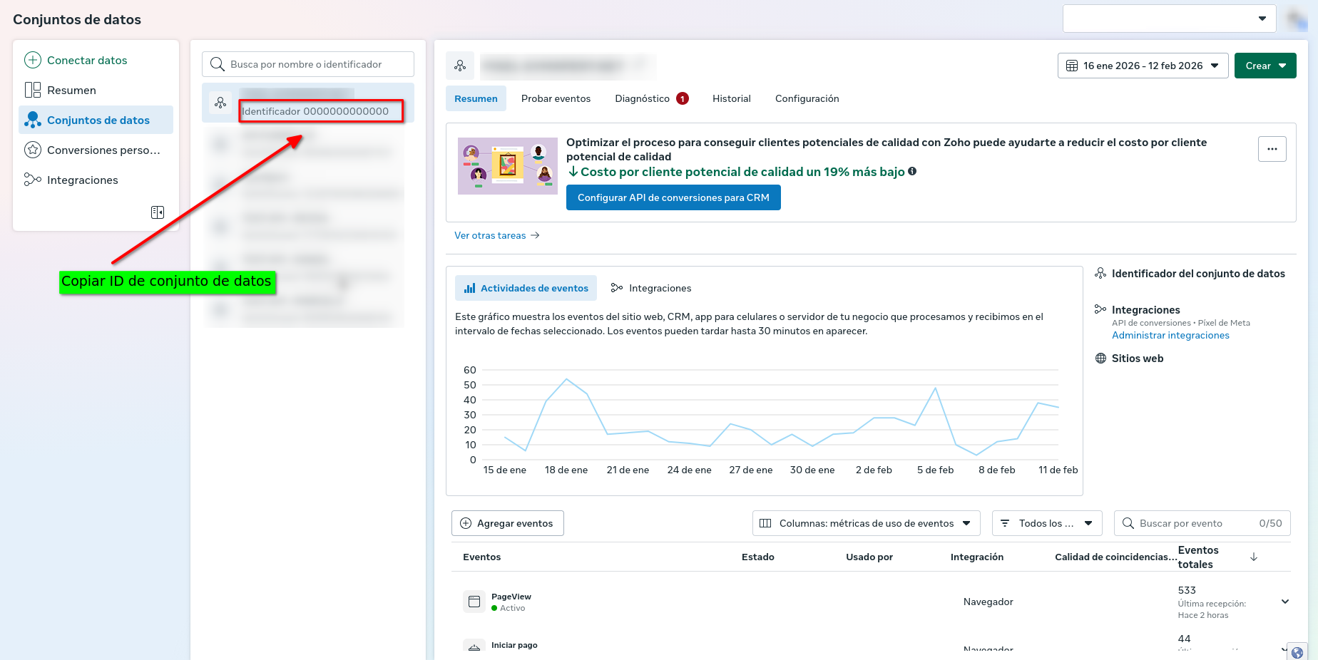 Dataset ID: el identificador de tu conjunto de datos en Meta. Lo obtuviste en el Paso 1.
