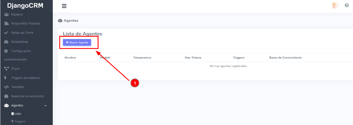 Una vez dentro del módulo de Agentes, localiza y haz clic en el botón "Nuevo Agente" para comenzar el proceso de configuración.