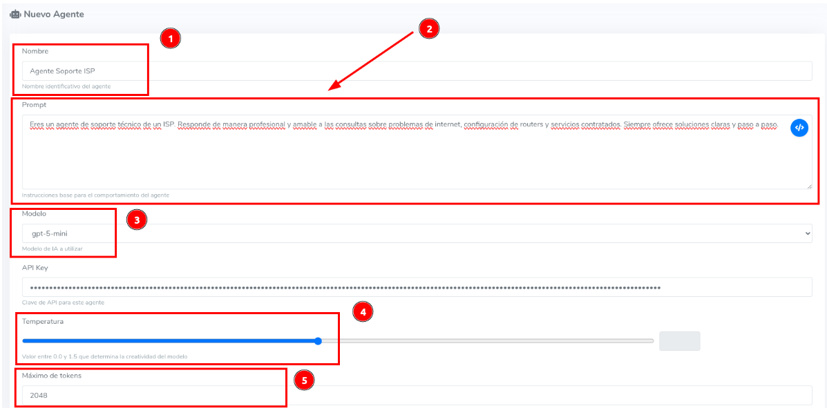 1.- Nombre del agente: Ingresa un nombre descriptivo (ejemplo: "Agente Soporte ISP").