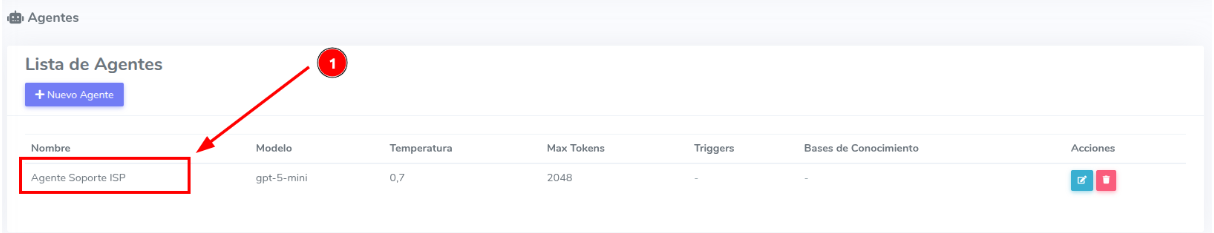 Una vez completado el formulario correctamente, haz clic en "Crear agente". El agente será creado y podrás visualizarlo en la lista de agentes disponibles. Desde aquí podrás editarlo o eliminarlo utilizando los íconos correspondientes.