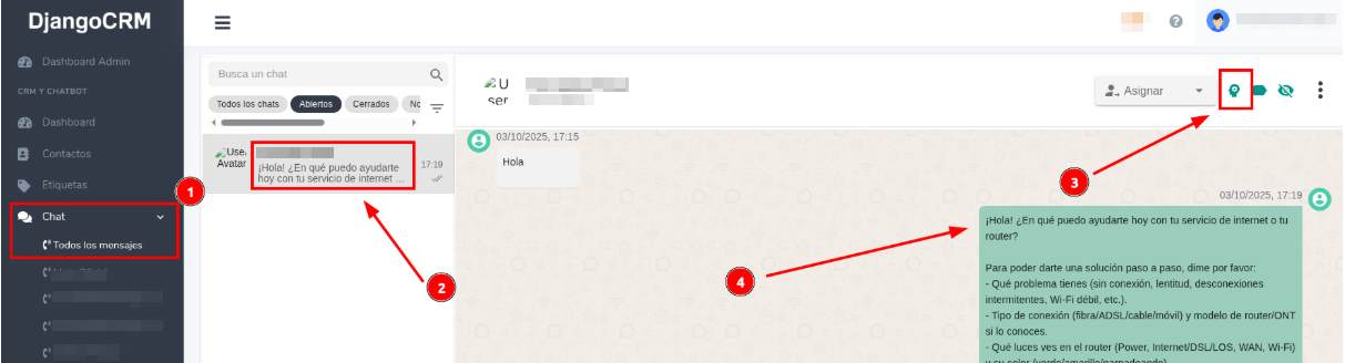 3.- Haz clic en el ícono de "Agente" para activarlo en esa conversación.