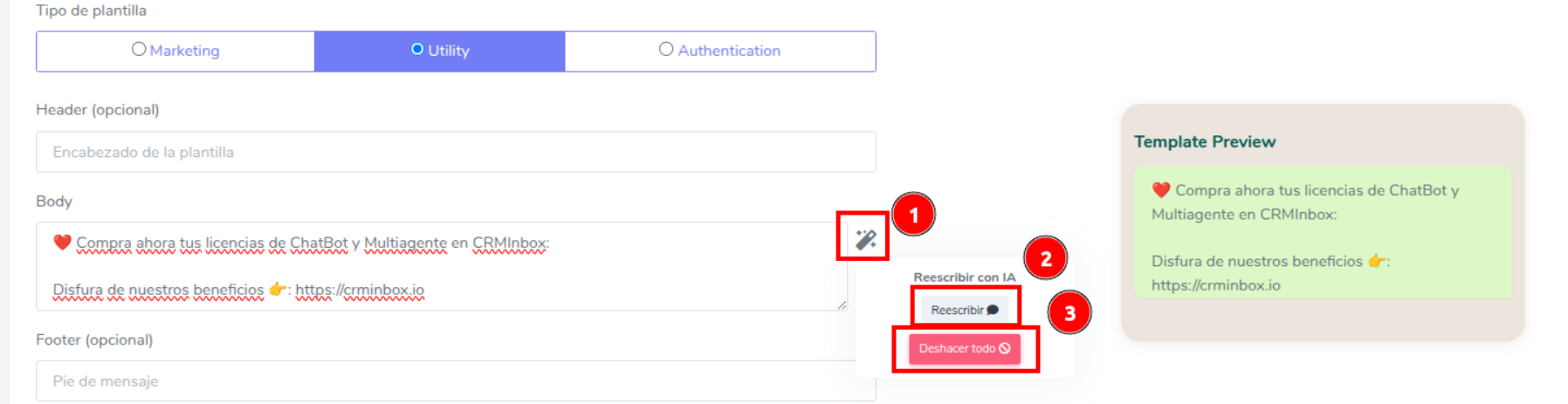 Mientras escribes tu plantilla, usa el botón "Reescribir con IA":