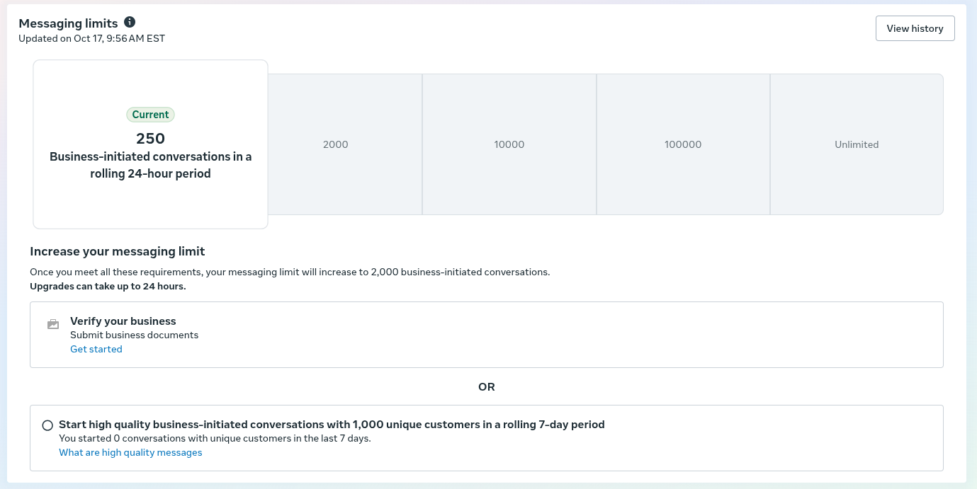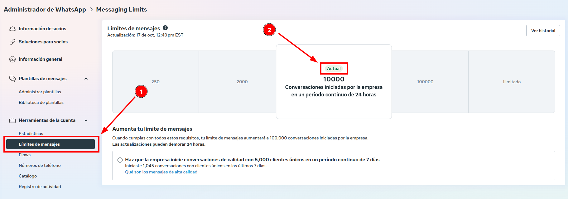 • WhatsApp Manager: business.facebook.com/latest/whatsapp_manager → "Límites de mensajes"